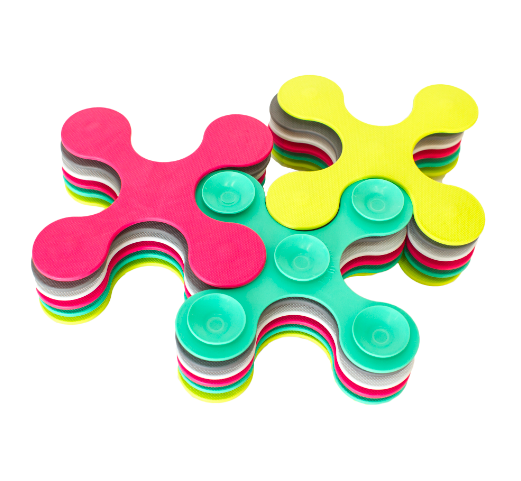 BathMat to sprytne połączenie maty do wanny z puzzlami. Mata składa się z 18 kolorowych elementów, które można swobodnie rozłożyć w wannie lub łączyć ze sobą tworząc antypoślizgową matę. Zwiększy to bezpieczeństwo zabawy dziecka w czasie kąpieli – zwłaszcza takiego, które samodzielnie siedzi lub w ferworze dobrej zabawy chce wstawać w czasie kąpieli. Poszczególne puzzle trzymają się powierzchni dzięki pięciu przyssawkom, to powoduje, że mata stabilnie przylega do podłoża wanny.