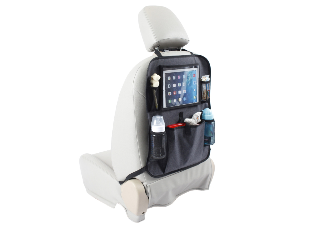 Praktyczny organizer na oparcie fotela samochodowego wraz z miejscem na tablet. Organizer posiada 2 kieszenie na butelki i 3 kieszenie na drobiazgi.