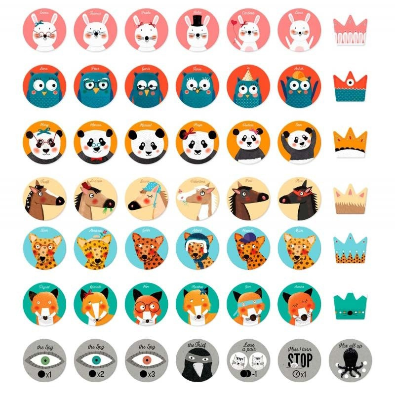 Gra: główny cel każdego zawodnika – znaleźć pasujące pary żetonów. Rozpoczyna rundę najmłodszy gracz, odwraca dwa żetony. Jeśli trafia pary – zatrzymuje je i gra dalej odwracając znowu dwa kolejne żetony. Jeśli nie znajduje pary – odwraca żetony, odkłada na miejsce i grę rozpoczyna kolejny zawodnik.