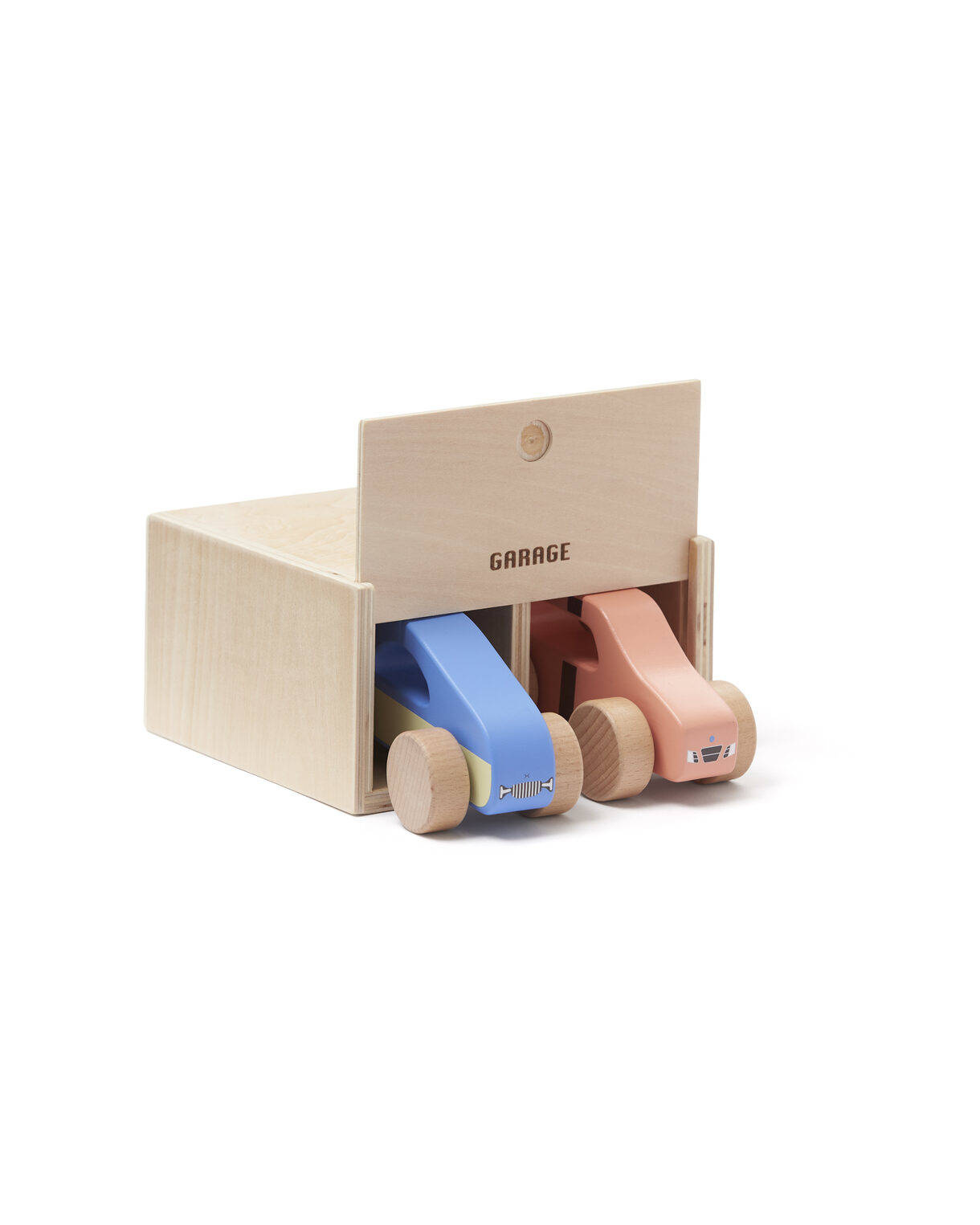 Zestaw zawiera drewniany garaż z miejscem na dwa pojazdy.