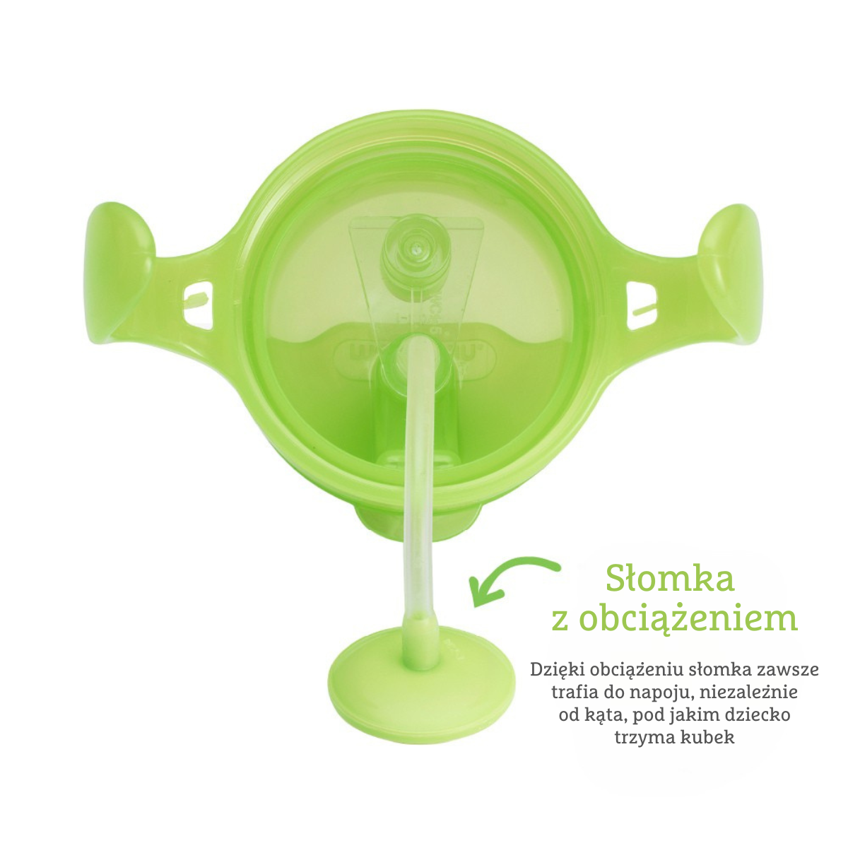 Praktyczny i wygodny kubek sprawi, że przejście z butelki na kubek niekapek stanie się proste i naturalne. Dzięki obciążonej słomce maluch może pić z kubka pod dowolnym kątem – tak jak z butelki, ale przy pomocy słomki. Miękka, elastyczna słomka jest delikatna dla wrażliwych dziąseł, a wygodne uchwyty idealnie pasują do małych rączek.