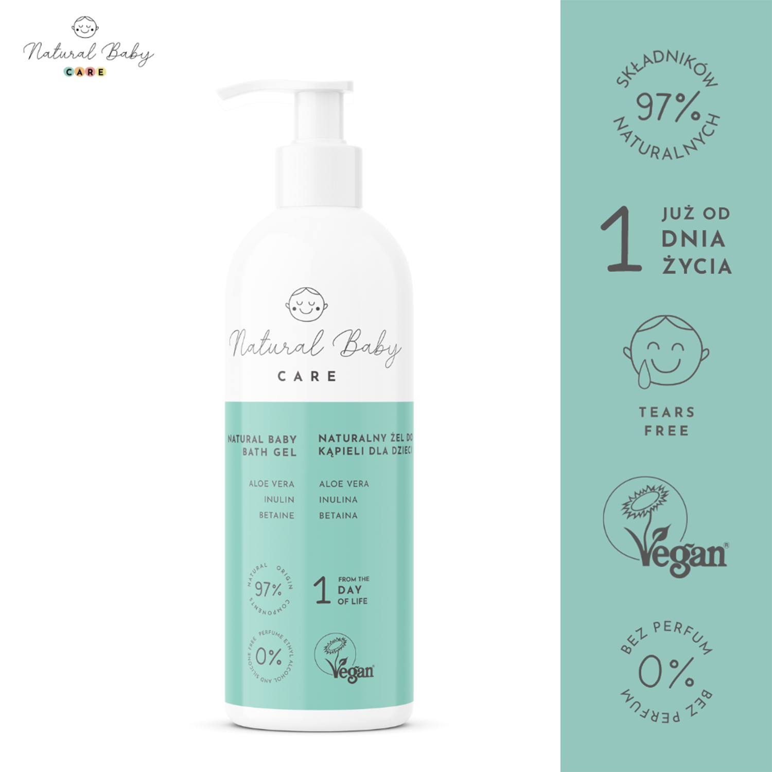 od 1 dnia życia, ten bezzapachowy żel doskonale pielęgnuje delikatną skórę dziecka. Zawiera 97% naturalnych