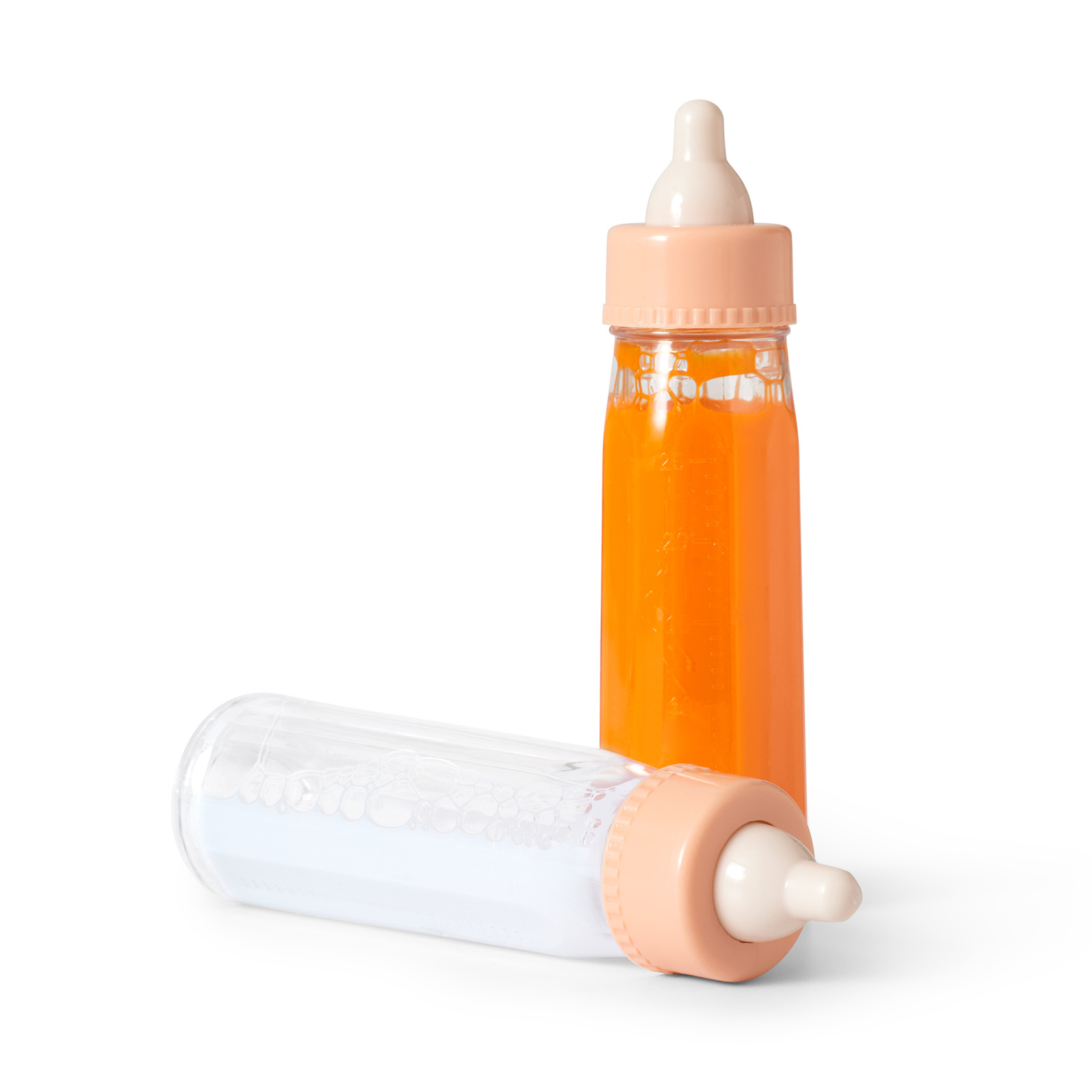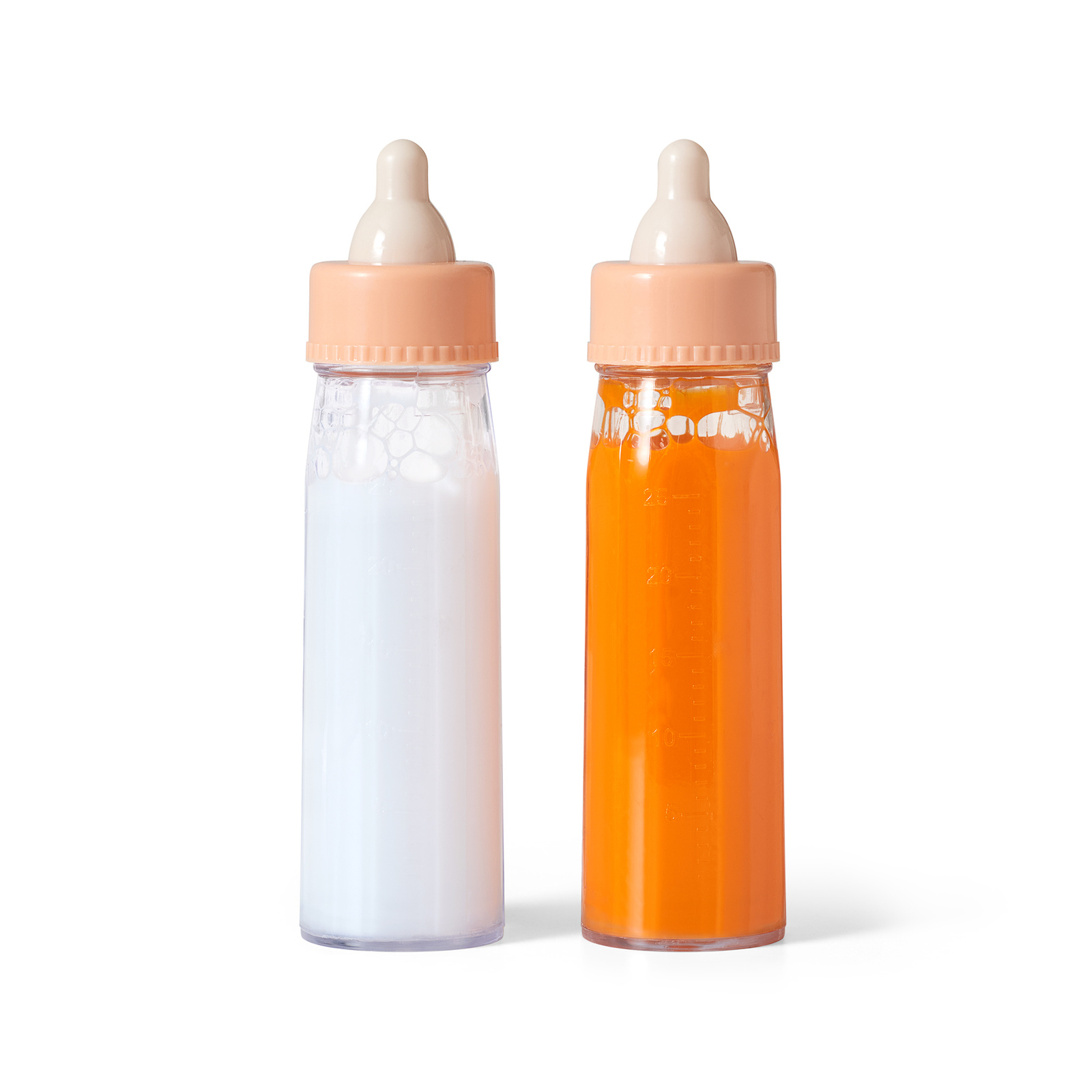 Podczas przechylania płyn wewnątrz butelek optycznie znika, co symuluje picie przez lalkę. Butelki wykonane są z materiałów dostosowanych do zabawy dziecięcej i mają rozmiar odpowiedni dla małych rąk.