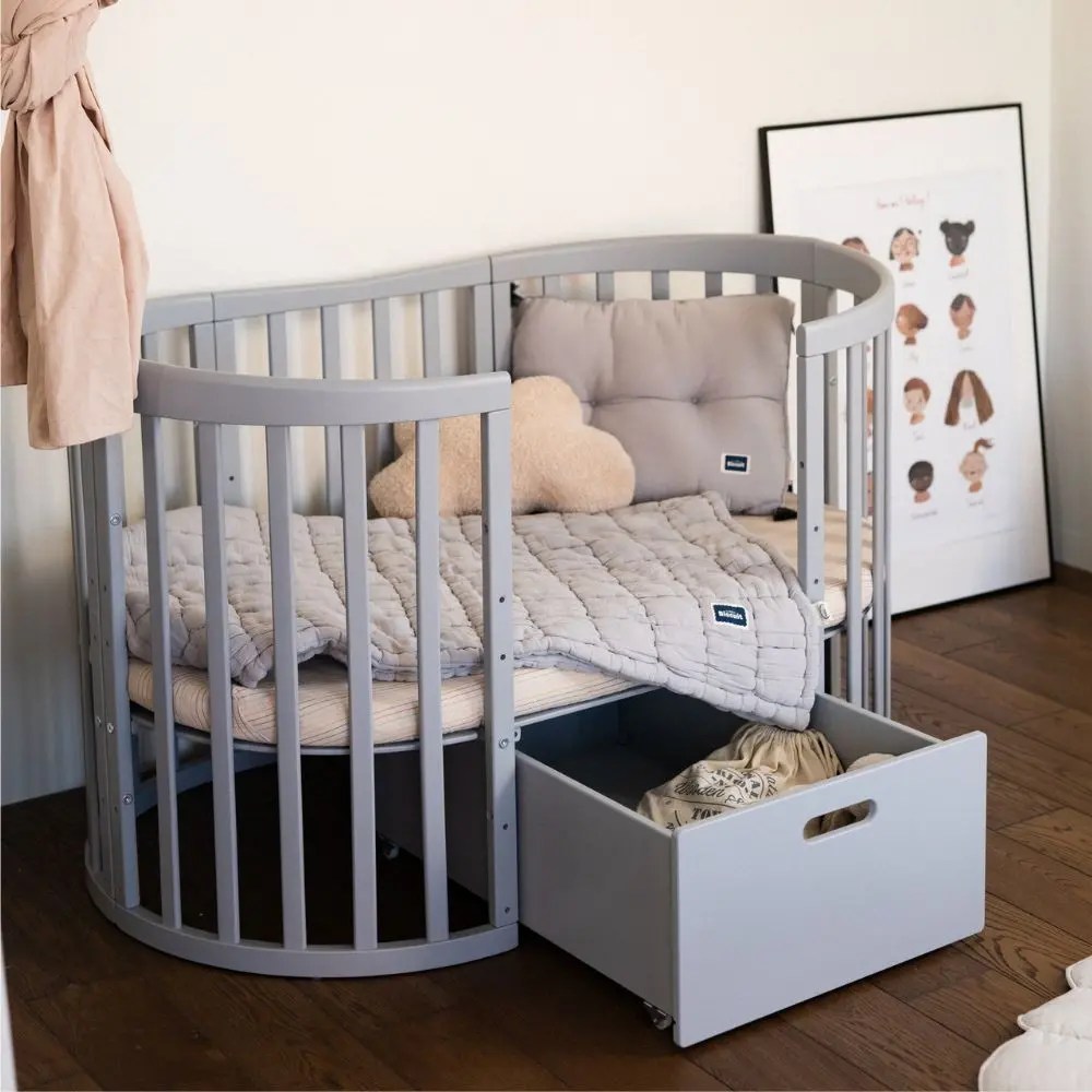 Szuflada pasuje zarówno do łóżeczka klasycznego 7w1, jak również do owalnego łóżeczka 7w1.