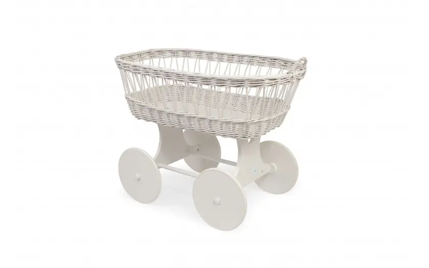 Wiklinowy kosz Mojżesza na drewnianym podwoziu.