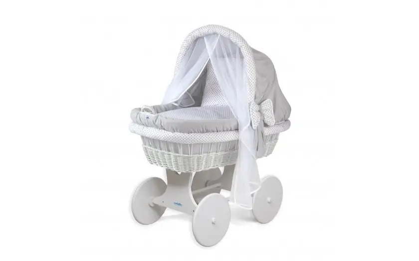 Kosz Mojżesza na drewnianym podwoziu z materacem i pełnym wyposażeniem.