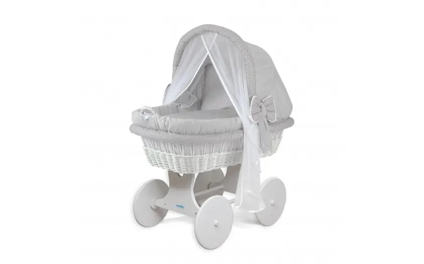 Kosz Mojżesza z materacem w kolorze białym z dodatkami: szary w białe groszki, w skład którego wchodzą: